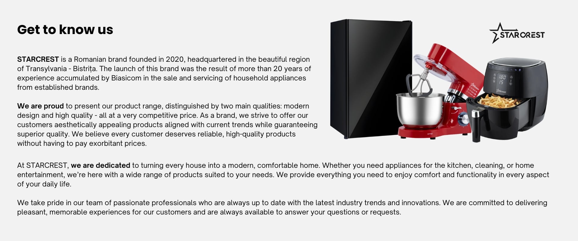 Welcome to the Starcrest universe! We are a Romanian brand founded in 2020 in Bistrița, offering our customers a wide range of household appliances designed to transform every house into a modern and comfortable home! The launch of Starcrest was the result of over 20 years of experience gained by Biasicom in the field of trading and servicing appliances from well-known brands.