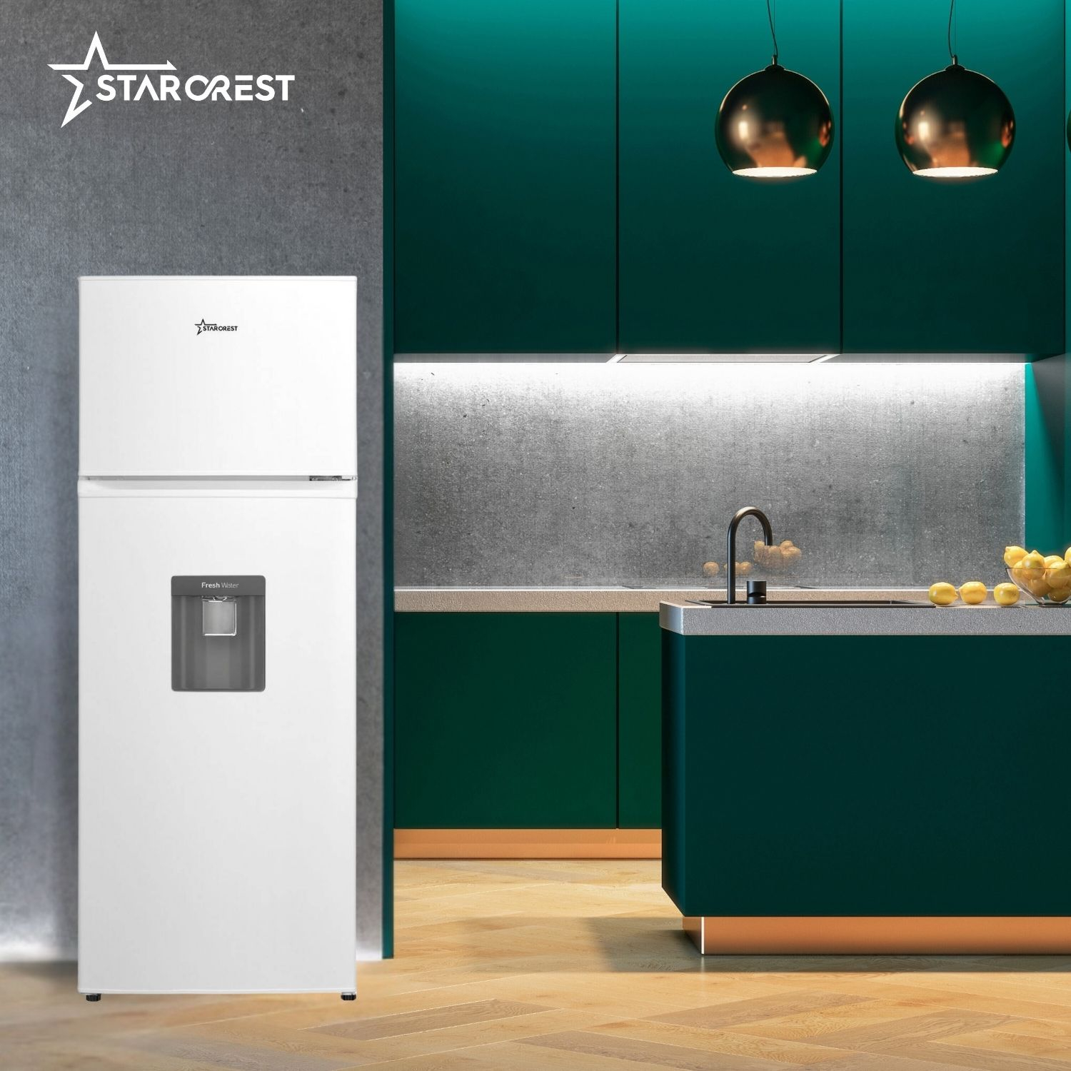 STARCREST 2-Door Refrigerator SF-203WD-WHE, 203 L, Class E, Water Dispenser, LED Lighting, Adjustable Thermostat, Reversible Doors, Height 145 cm, White