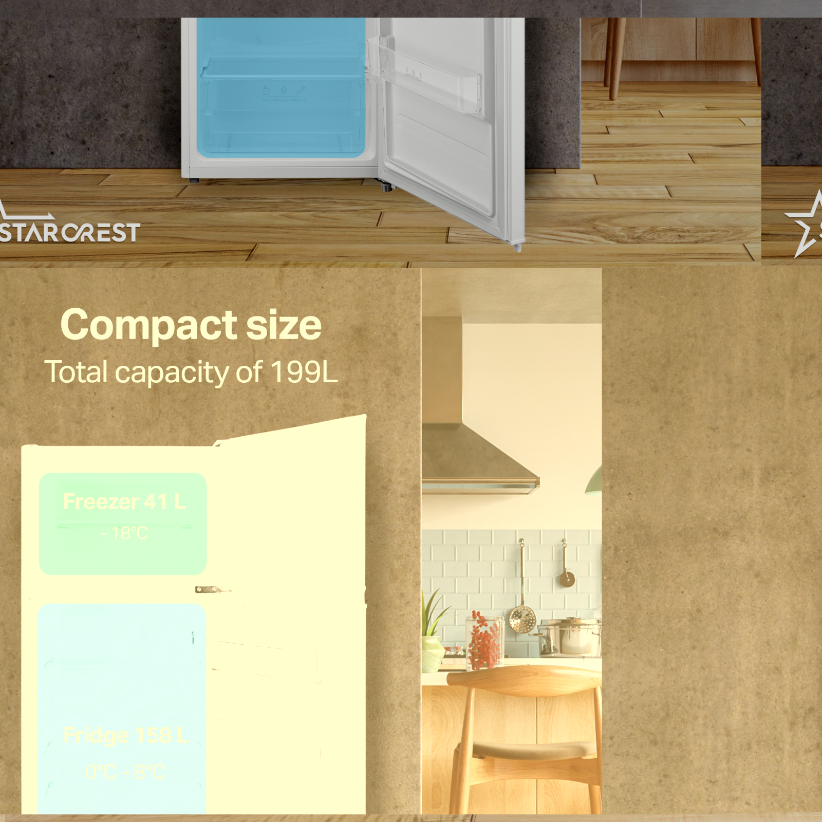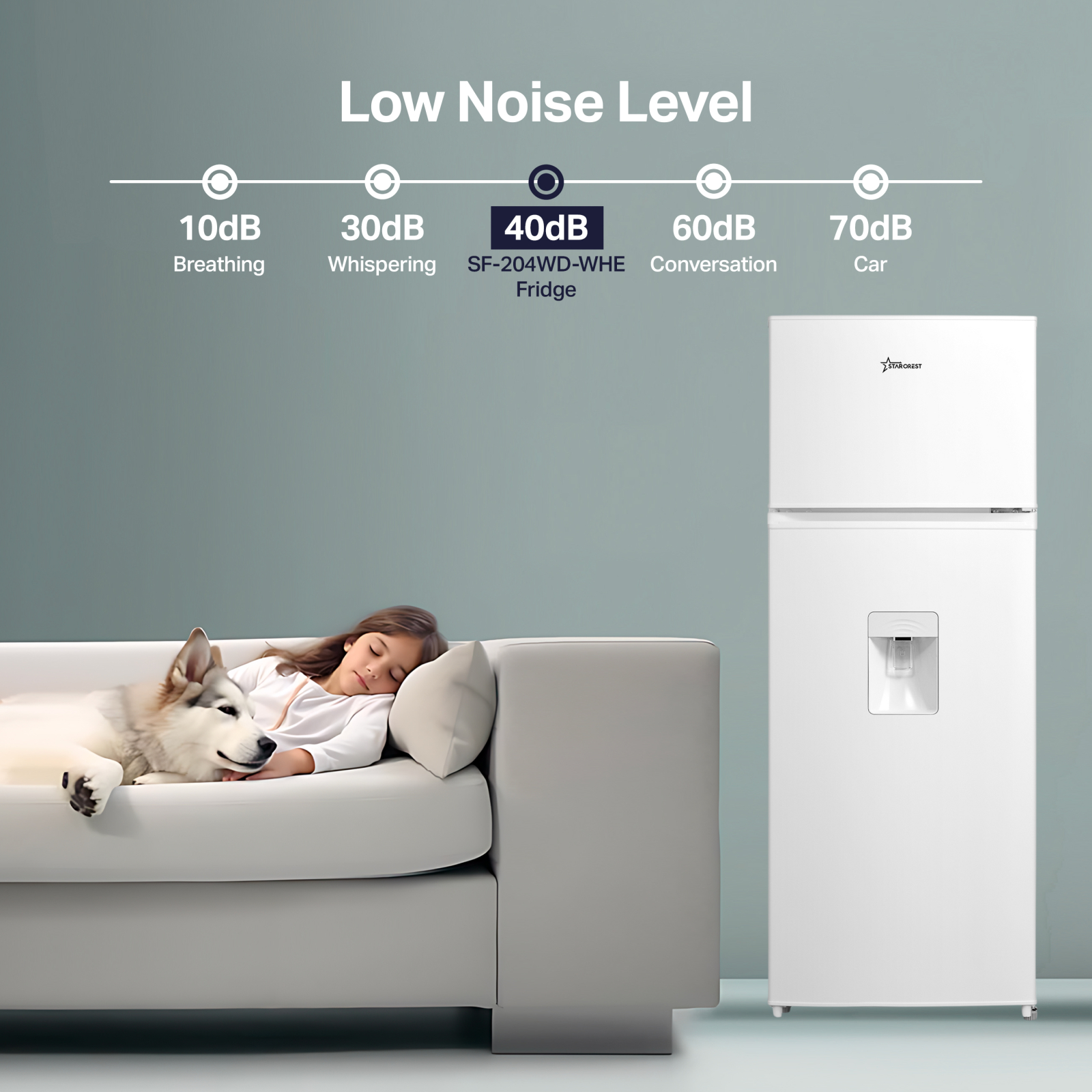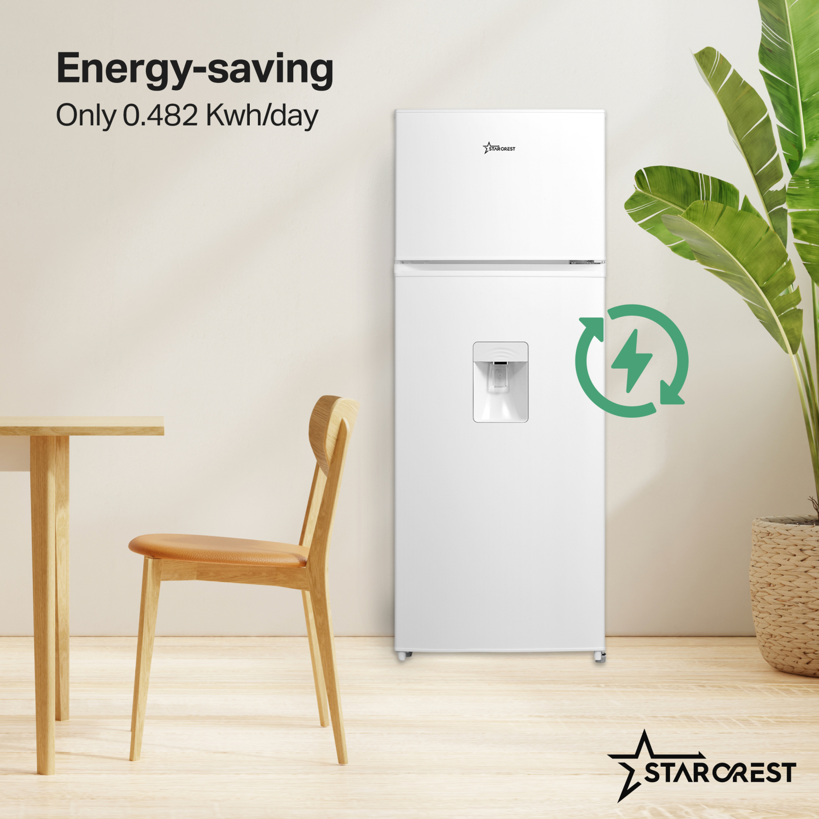 STARCREST 2-Door Refrigerator SF-204WD-WHE, 199 L, Energy Class E, Water Dispenser, LED Lighting, Adjustable Thermostat, Reversible Doors, 143 cm Height, White