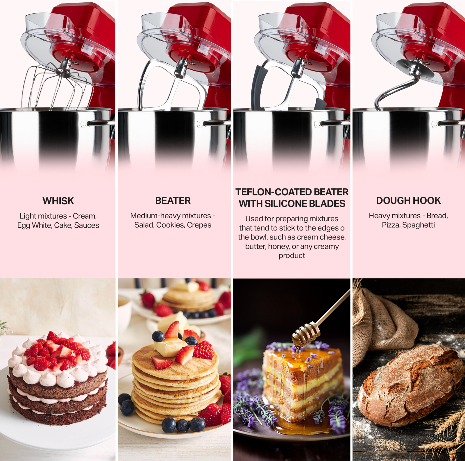 Included accessories: Stainless steel whisk, dough hook, mixing paddle, Teflon-coated paddle, paddle with silicone gasket, bowl, bowl lid