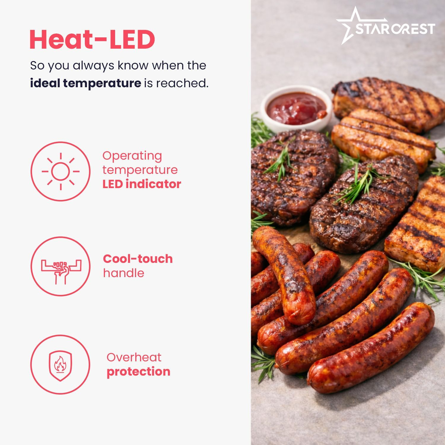 The Starcrest SGR-2924BX Electric Grill is designed for fast and efficient grilling, making it suitable for everyday use in any kitchen. With a power of 2200 W, the appliance provides rapid heating and high performance for even cooking.