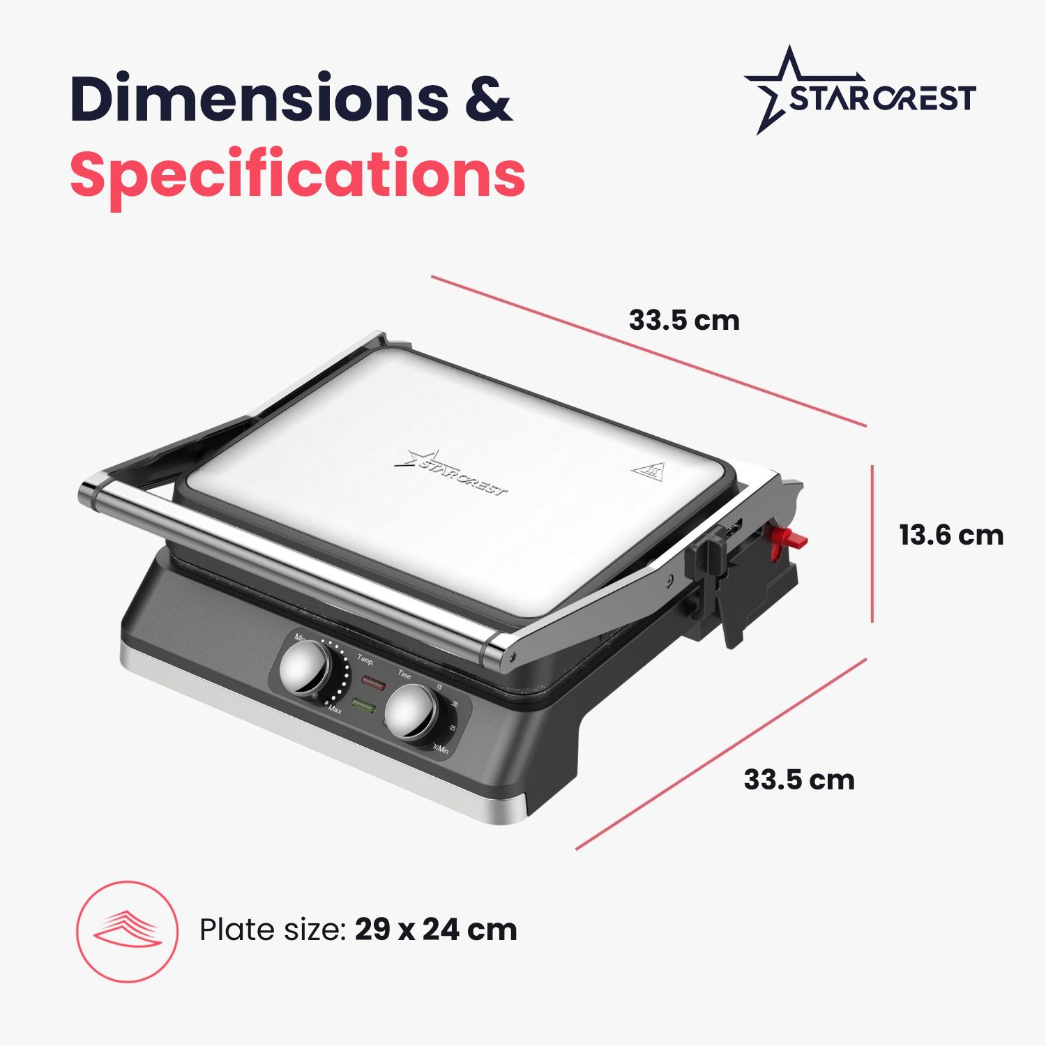 STARCREST SGR-2924BX Electric Grill, 2200 W, ceramic-coated grill plates, adjustable thermostat, timer, 180° opening, cooking surface 29 × 24 cm, cleaning spatula, black/stainless steel