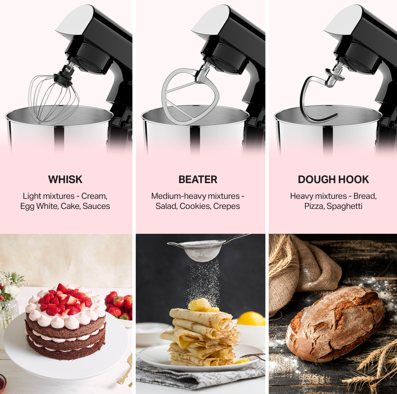 • Dough hook – suitable for heavy doughs (bread, brioche, pizza)