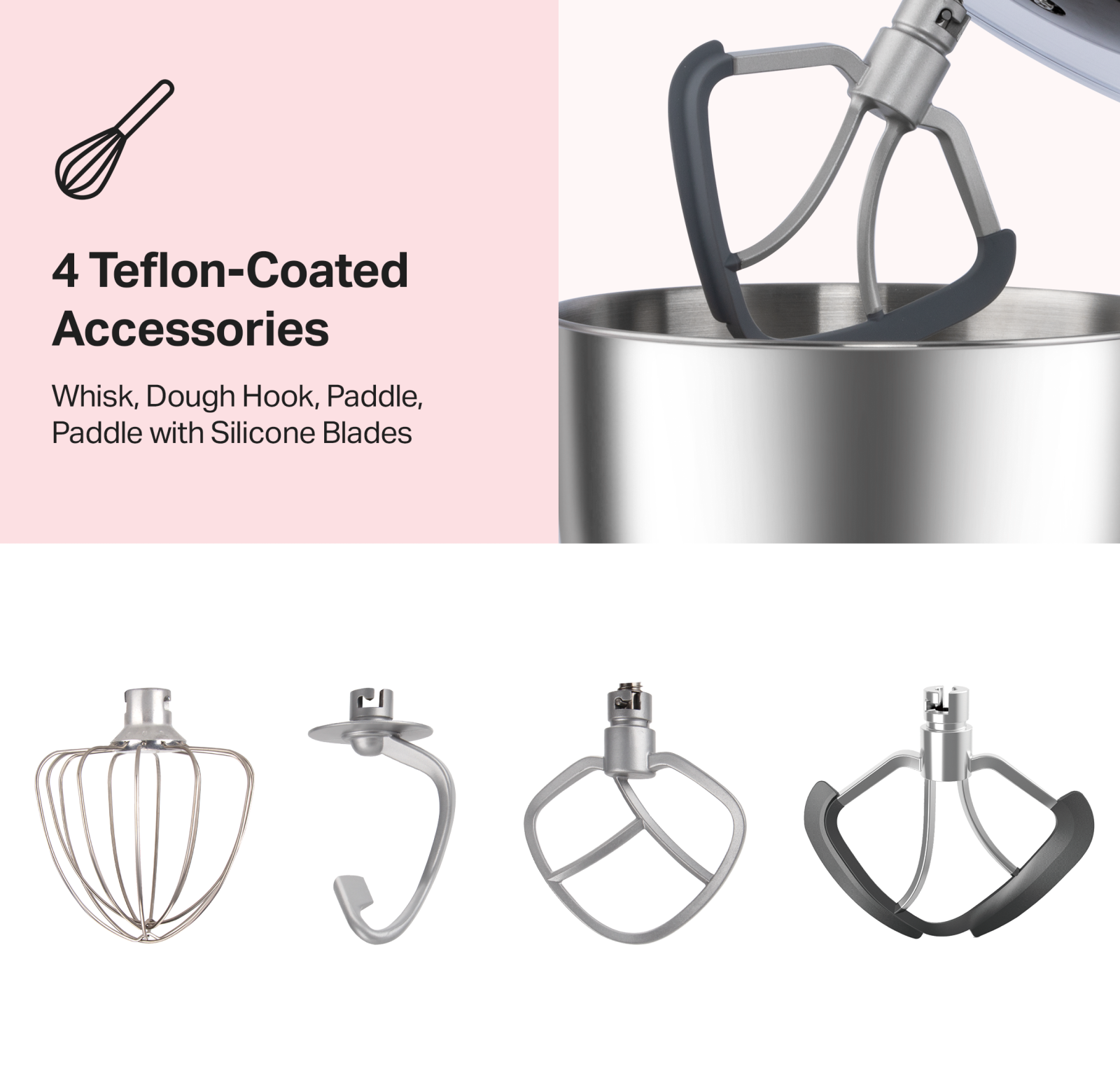 Included accessories: stainless steel whisk, dough hook, mixing paddle, non-stick paddle, bowl, bowl lid