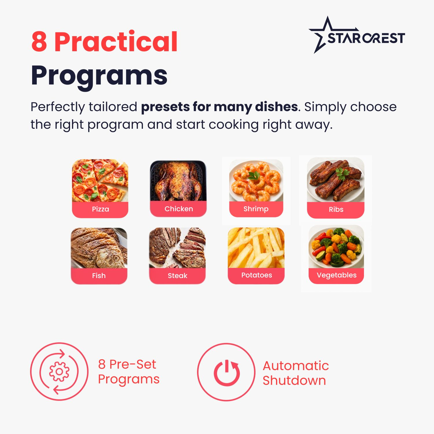 The unique combination of hot air circulation and perfect temperature in the STARCREST fryer allows you not only to fry foods but also to bake, grill, and roast them.