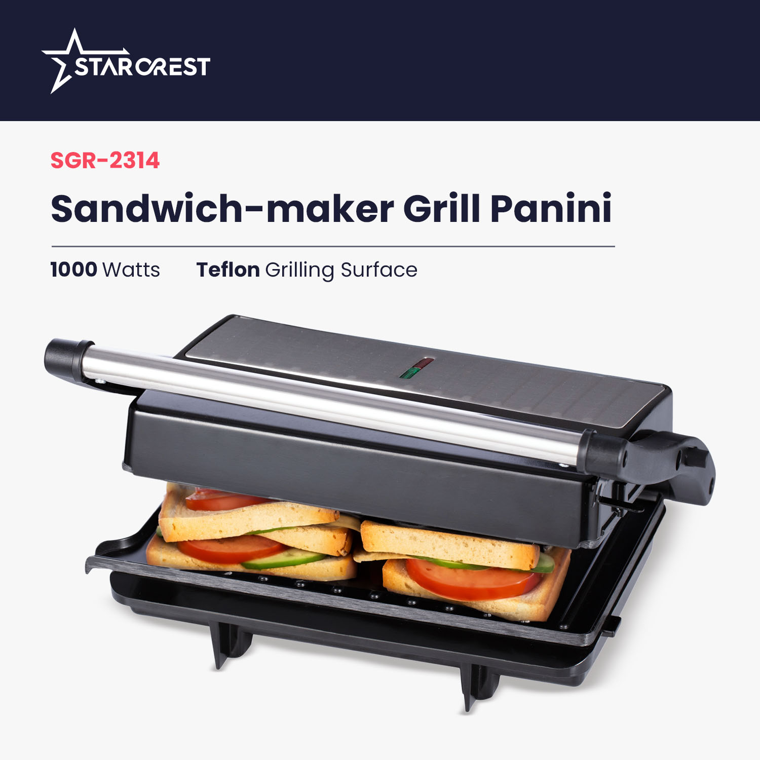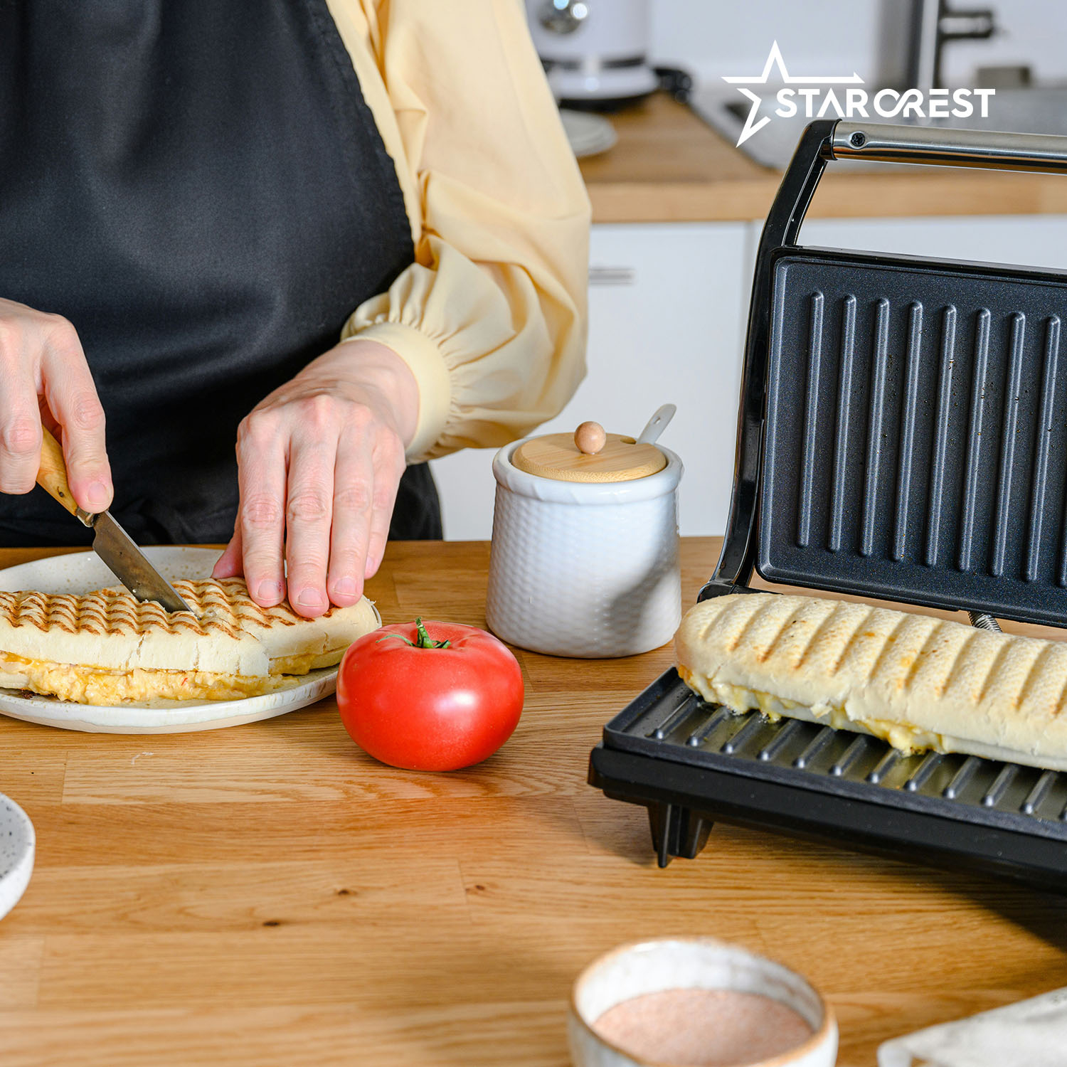 The STARCREST SGR-2314 electric grill is perfect for preparing sandwiches, meat, fish, and grilled vegetables.