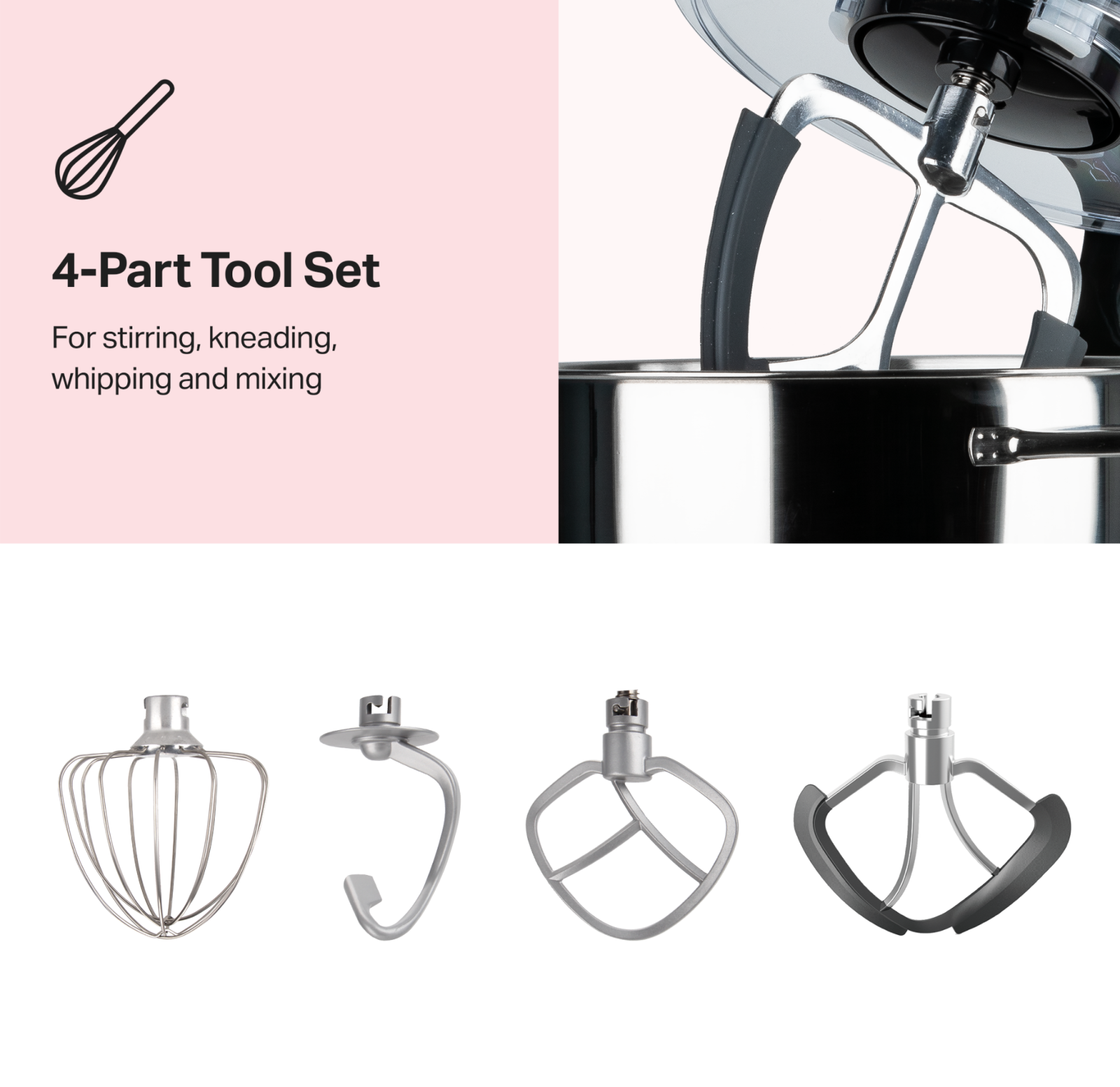 The stand mixer comes equipped with four different accessories. The included whisk is ideal for whipping cream. Use the dough hook for kneading bread dough, and the paddle is perfect for cake batter.